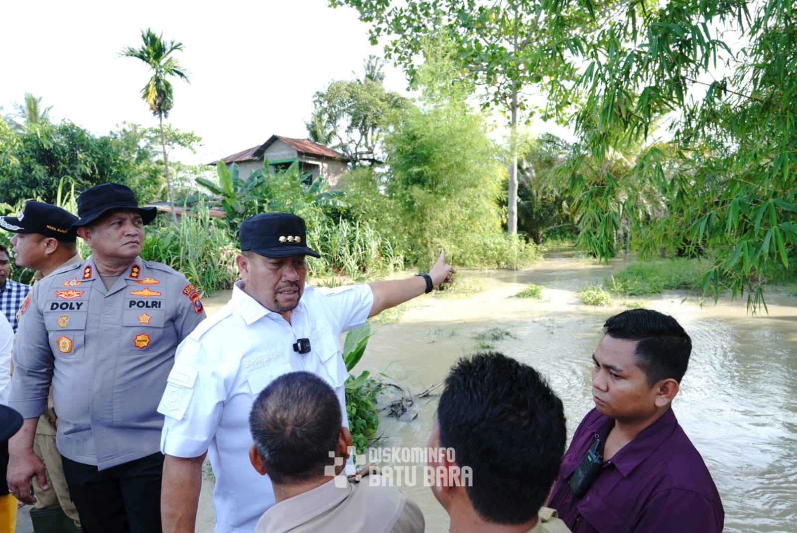 BATUBARAPOS.com, BATU BARA | Usai meninjau lokasi tanah longsor di Kecamatan Lima Puluh, Bupati Batu Bara, H. Baharuddin Siagian, S.H., M.Si., kembali menunjukkan kepedulian nyata terhadap warganya. Bersama Wakil Bupati Syafrizal, S.E., M.AP., Kapolres Batu Bara, dan Bendahara DPD Partai Gerindra Sumatera Utara, Yin Map, Bupati turun langsung meninjau lokasi banjir di Kecamatan Medang Deras, Senin (13/10/2025).